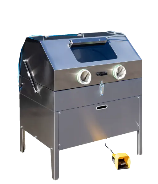 - Le bac de dégraissage est fermé par un capot muni de hublots et l’opérateur peut travailler en passant les mains et les avant-bras dans un gant incorporé à la fontaine.